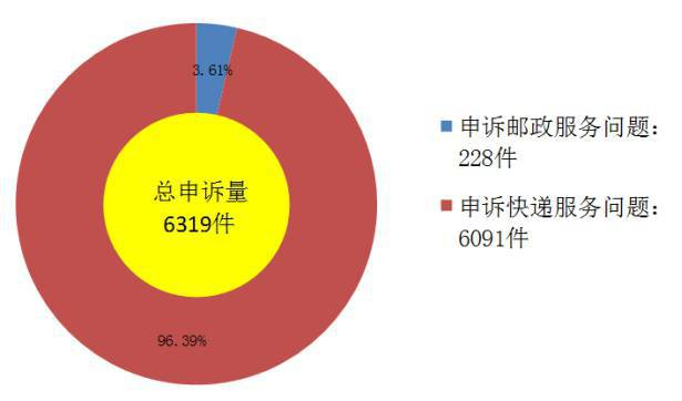 2018年3月份,河南省邮政管理局通过“12305”邮政业消费者申诉电话、申诉网站、局长信箱、公众留言、微信平台共受理消费者申诉6319件。申诉中涉及邮政服务问题的228件,占总申诉量的3.61%;涉及快递服务问题的6091件,占总申诉量96.39%。