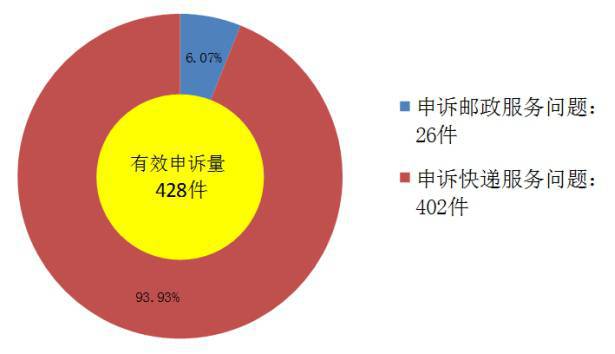 受理的申诉中有效申诉(确定企业责任的)428件,环比下降22.70%,同比下降35.30%。有效申诉中涉及邮政服务问题的26件,占有效申诉量的6.07%;涉及快递服务问题的402件,占有效申诉量的93.93%