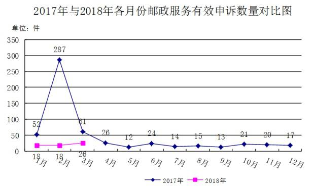 2018年3月份,消费者关于邮政服务问题的有效申诉26件,环比增长44.40%,同比下降57.40%。